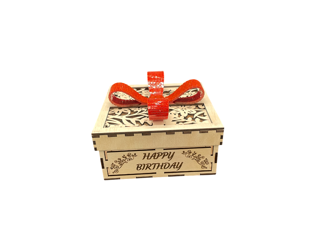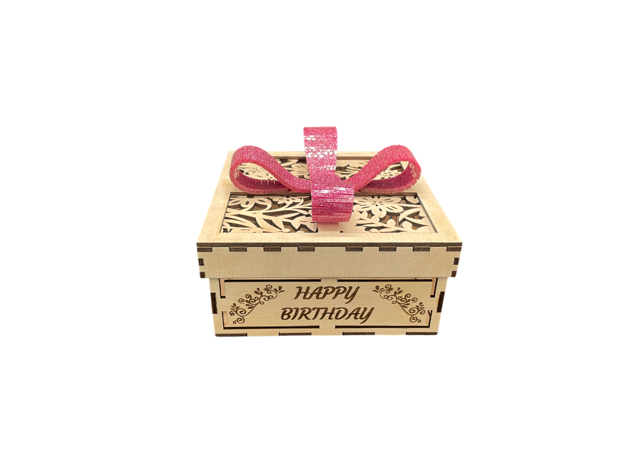 This charming square-shaped gift box is crafted from 3mm laser-cut panels, featuring custom engraved messages to suit any occasion and a stunning 3D laser-cut bow on the lid.